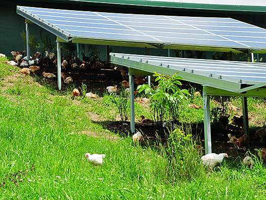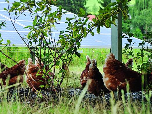 Bei der Beschattung ist wahrlich vieles möglich. Geflügel ist für jedes schützende Gestaltungselement dankbar. Egal, ob Sträucher, Bäume, Heckenalleen oder technische Unterstände. Werden diese Beschattungselemente in unmittelbarer Nähe zum Stallgebäude beginnend angeboten und in weiterer Folge in Abständen von maximal zehn Laufmetern von einem schützenden Areal zum nächsten, dann werden auch die entferntesten Auslaufareale genutzt. Meistens bewegen sich die Tiere im Auslauf in kleinen Gruppen, seltener sind die Tiere einzeln unterwegs. Deshalb sollte bei technischen Unterständen sowie bei der natürlichen Bepflanzung berücksichtig werden, dass diese Gruppen Platz haben, damit das Herdenverhalten auch ausgelebt werden kann. Sind diese schatten- und schutzspendenden Areale je Einheit zu klein, werden diese auch nicht genutzt.