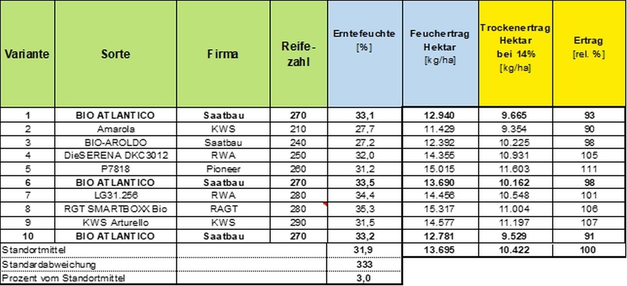 Den höchsten Ertrag lieferte die Sorte P7810 mit 11.603 [kg/ha], gefolgt von der Sorte KWS ARTURELLO mit 11.197 [kg/ha]. Die Erntefeuchte lag im Mittel bei 31,9%. Die Standardabweichung liegt mit 333 [kg/ha] bei 3% vom Standortmittel. Aufgrund der Reinheit der Ernteware wurde kein Besatz abgezogen.