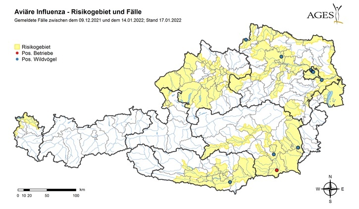 Auf Grund mehrerer neuer Fälle von Geflügelpest in Geflügel-Nutztierbeständen bzw. Funden verendeter Wildvögel wurde die Liste der Gemeinden und Bezirke im Risikogebiet mit Wirksamkeit 21. Jänner 2022 erweitert. Eine Übersichtskarte und eine aktuelle Liste der betreffenden Gemeinden bzw. Bezirke finden Sie am Ende des Beitrags.